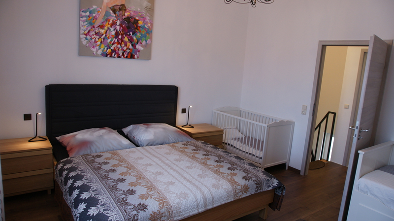 Oben befindet sich ein Bad mit WC und große Schlafzimmer. In diesem Schlafzimmer finden Sie einen Doppelbett und eine Schlafsofa, wo weitere 4 Personen sich ausruhen können. Für die Familien mit kleinen Kindern steht ein Babybett im Schlafzimmer zur Verfügung.